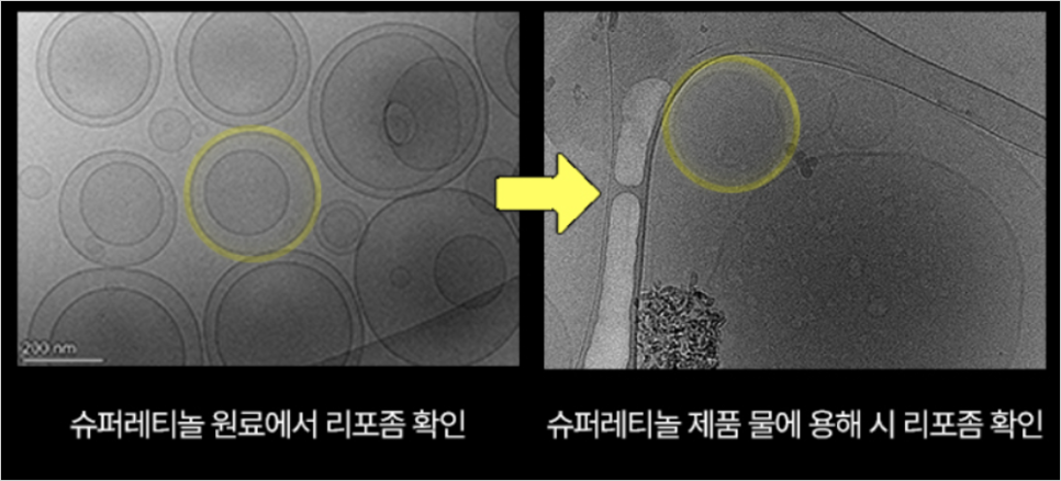- 원료 및 완제품 모두 리포좀 확인: 특히 리포좀은 온도에 취약하여 형태 유지가 어려운데, 아모레퍼시픽은 자체 연구 기반 기술력으로 원료는 물론 완제품(섭취 형태)에서도 리포좀을 확인했습니다. 슈퍼레티놀에는 리포좀 레티놀 + 비타민C가 47.664% 함유되어 있어, 최상의 흡수율과 효과를 기대할 수 있죠! 🔬